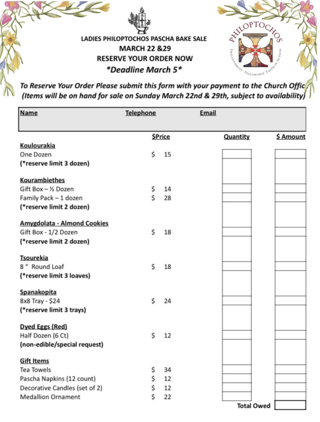 During coffee hour, we’ll have a table for Philoptochos stewardship (membership), Pascha Bake Sale pre-orders, and copies of our Lenten retreat speaker Sarah Byrne-Martelli, DMin, BCC-PCHAC’s book, Memory Eternal: Living with Grief as Orthodox Christians. Copies will be available in the fellowship hall for $16. Payment can be made by cash, credit card ( $2 fee applies) and check - made out to Ladies of Philoptochos.